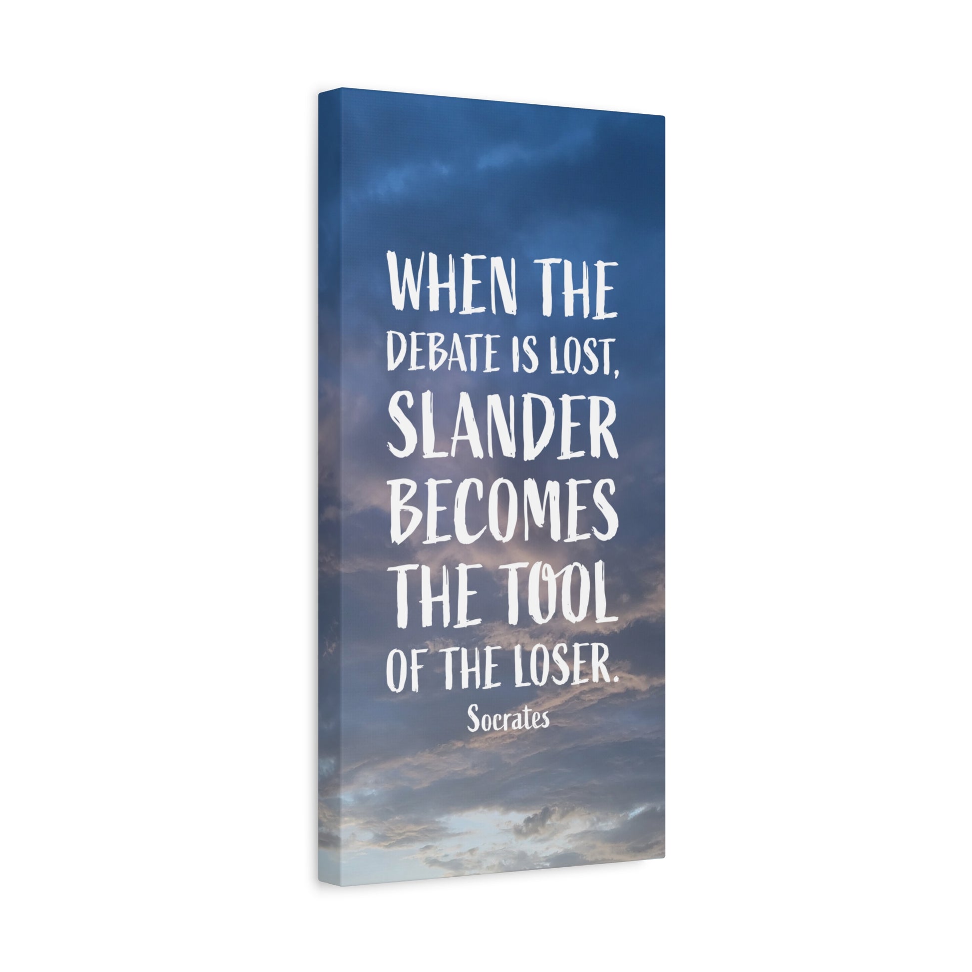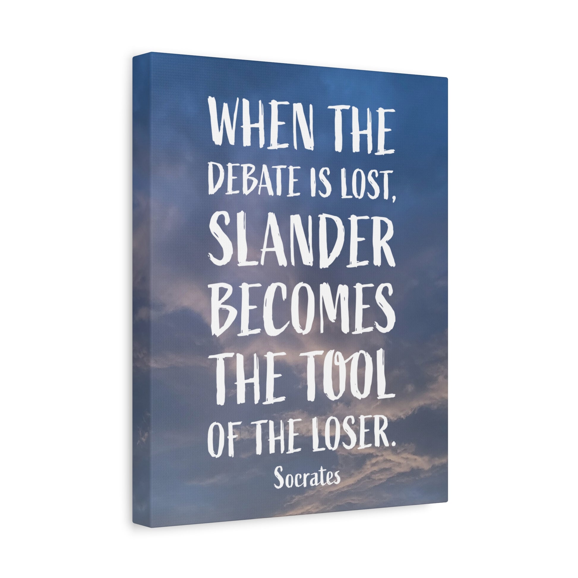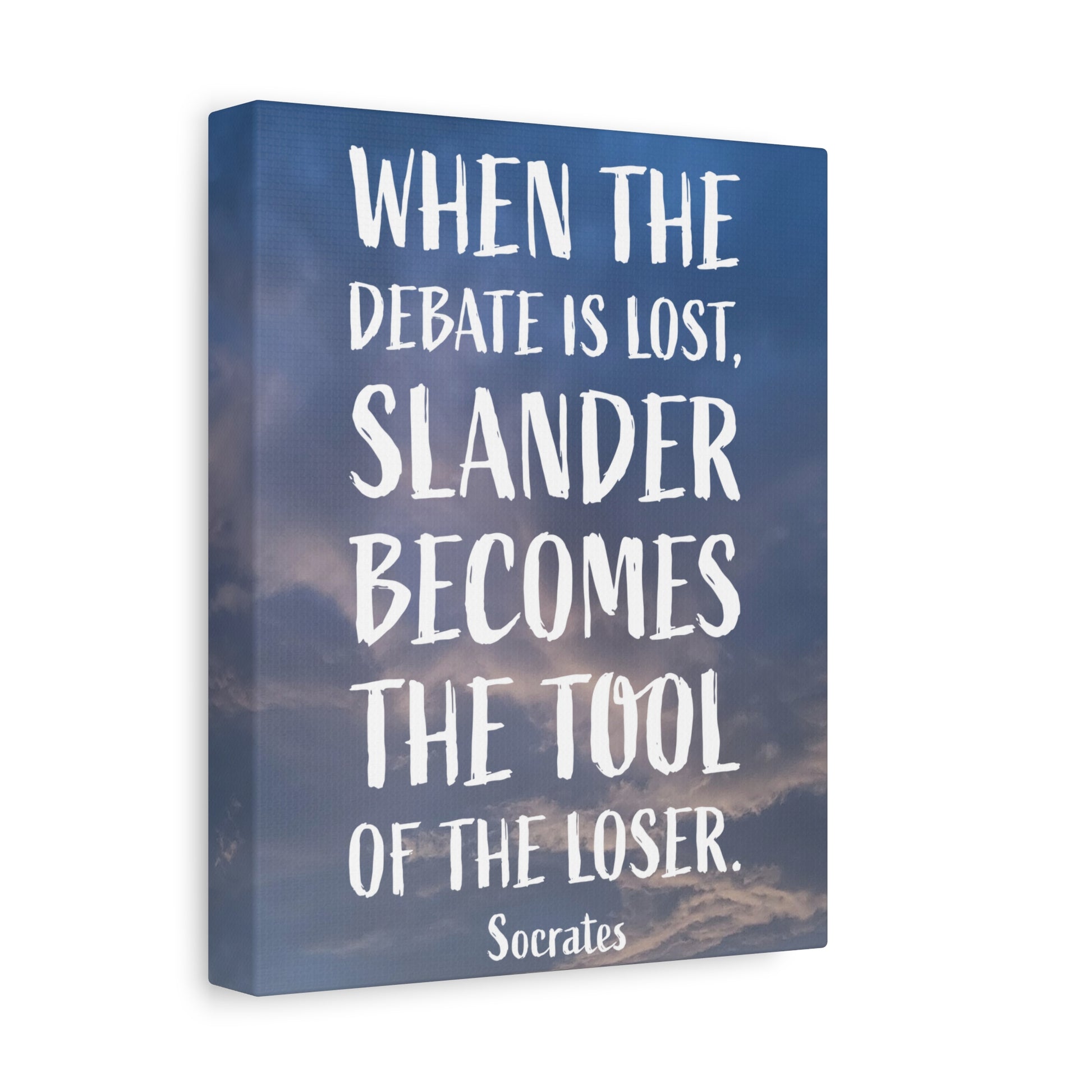 This 'Debates Socrates' canvas print featuring the quote, "When the debate is list, slander becomes the tool of the loser. -Socrates", brings a classical and intellectual vibe to any space. Perfect for history buffs, philosophy enthusiasts, or students. Ideal for decorating a study room, office, or library. Great for gifts on occasions such as birthdays, graduations, or as a teacher appreciation gift.