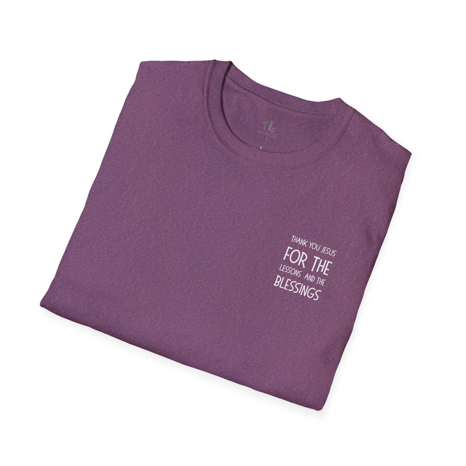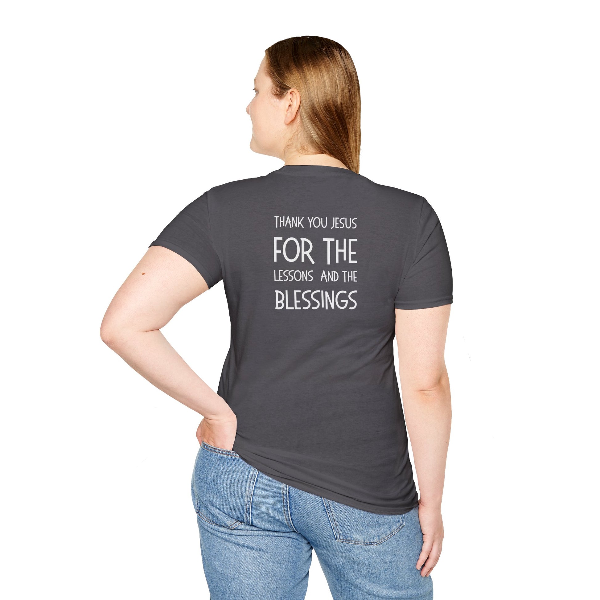 A soft tee with a powerful message thanking Jesus for lessons and blessings. This comfortable and versatile shirt is perfect for everyday wear and can be dressed up or down for any occasion. Suitable for adults, this shirt is made from durable, smooth fabric that is perfect for printing, with special attention to details like a ribbed knit collar for shape retention.